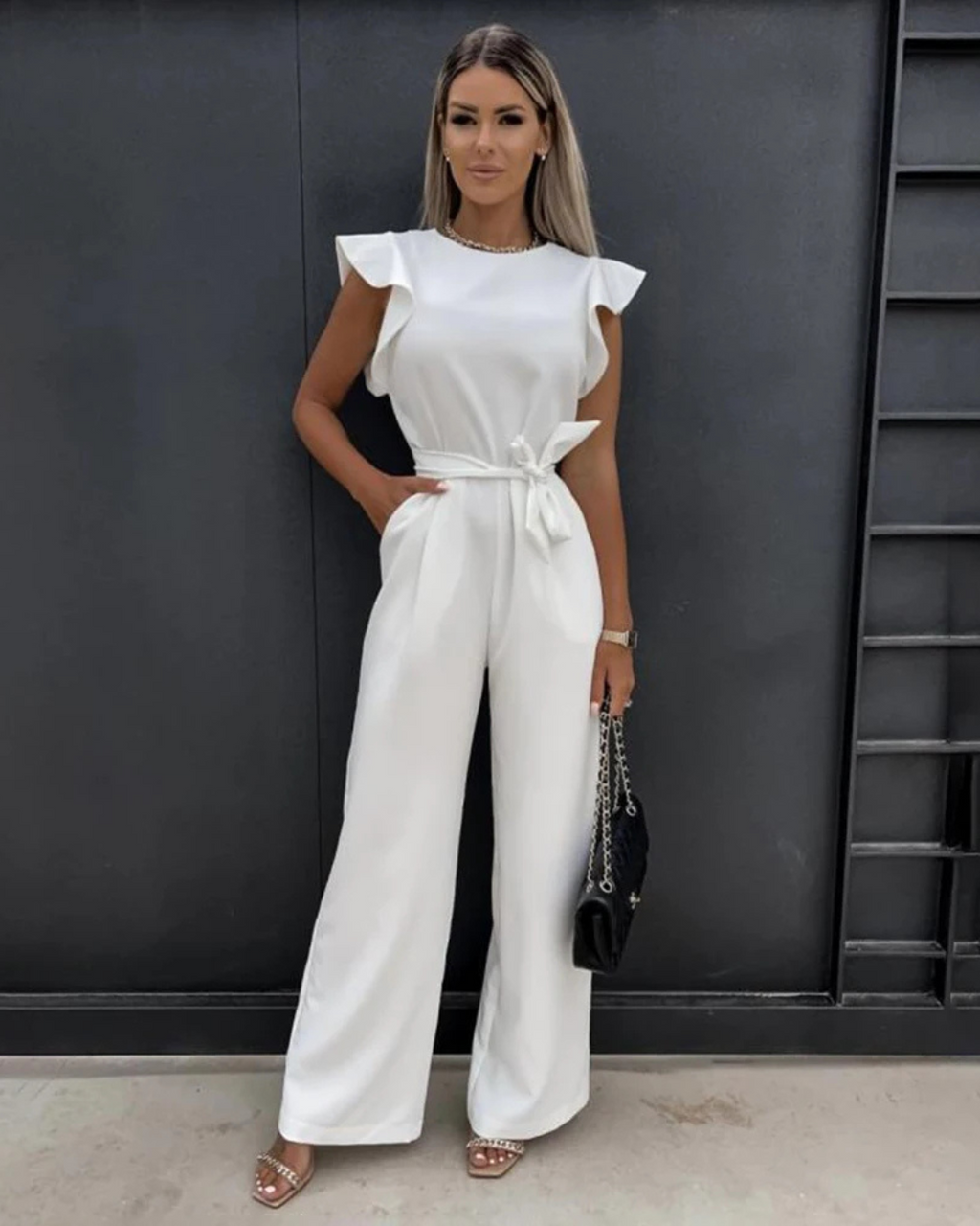 Design: Jumpsuit com mangas de borboleta, corte de pernas largas e modelagem fluida.